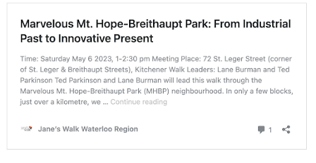 After a few years hiatus, MHBPNA is sponsoring a Jane’s Walk this year. We encourage everyone to check out the Jane’s Walk Waterloo Region website to see all the walks in Cambridge, Waterloo and Kitchener. It will be an excellent weekend.